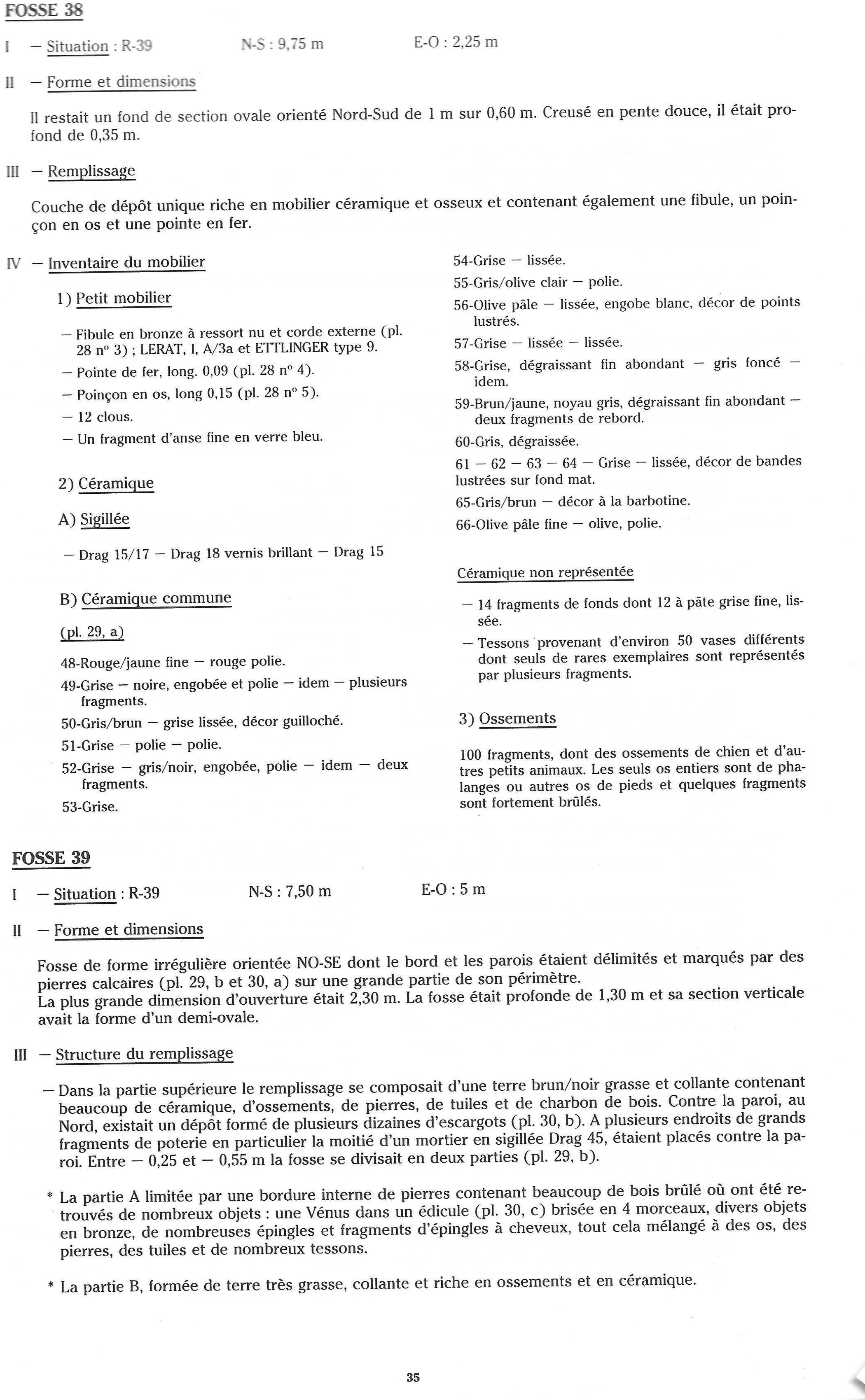 Une première partie donne une description détaillée des résultats des fouilles des fosses, puits et autres bâtiments. La deuxième partie est une analyse de ces données, et la troisième comprend des essais d’interprétation du site et de sites similaires